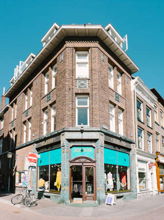 Utrecht, Netherlands - May 15, 2019: typical Dutch architecture. On the ground floor Jason King clothing store