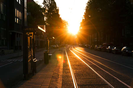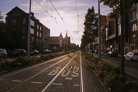 Beautiful early morning sunrise in spring, urban street scene in Amsterdam, the Netherlands