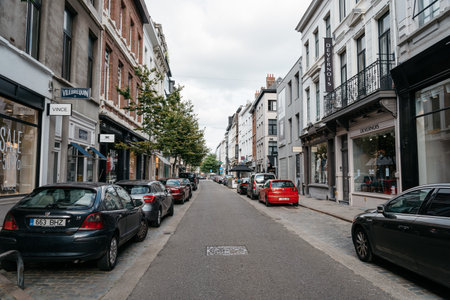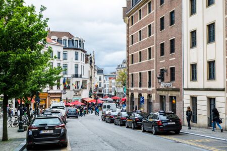 Street view of old downtown with lots of people walking at the street of Brussels, Belgium.