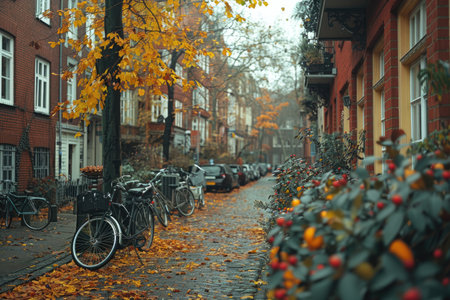 Autumnal City Street with Parked Bikes and Fallen Leaves