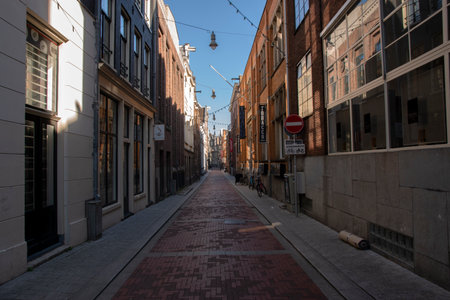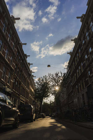 AMSTERDAM, NETHERLANDS - Mar 09, 2019: This is a photo looking up at the sky and including the street using leading lines.