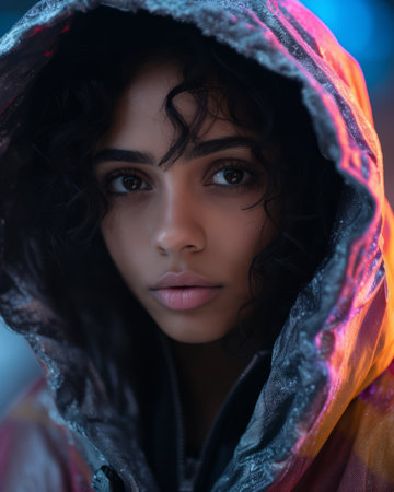 Dark colorful studio portrait of a cool black woman wearing hoodie
