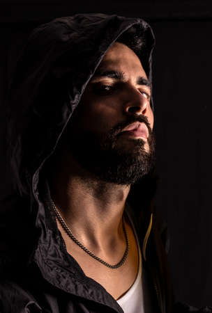 Portrait of a man in a hood on a black background. Generative AI.
