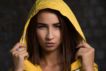 Confident serious woman portrait under yellow hood