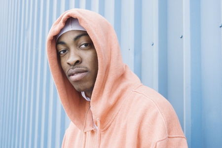 Portrait of a black man in a raincoat with a hood.