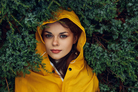 A young woman in a yellow raincoat hiding behind green leaves, exploring nature on a rainy day