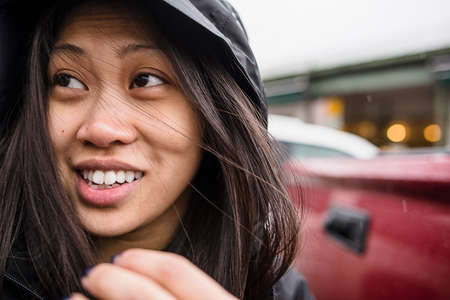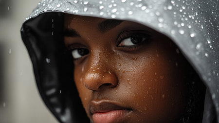 Close-up of a woman wearing a grey raincoat with raindrops glistening on her hood, focusing on her calm expression as she faces the rain