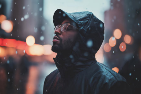 Portrait of a fashionable man wearing a windbreaker with hood up, enjoying the rain and snowflakes falling in a city at night