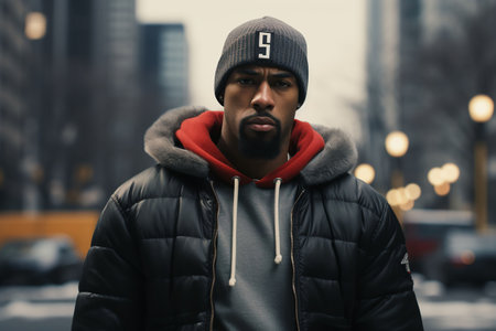 A young Afro-American man wearing a stylish jacket and a matching hat. AI-generated.