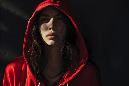 A determined woman in a red hoodie stands in dim light exuding confidence and bravery in the darkness. Concept Portrait Photography, Light and Shadow, Determination, Confidence, Bravery