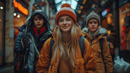 A joyful group of four friends stands close together in a bustling winter market. They wear colorful hats and scarves, sharing laughter and smiles against a festive backdrop.