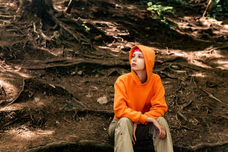 girl teenager in a hoodie sits on a natural background