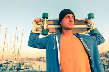 Thoughtful man holding skateboard on shoulders looking at sunset - Hipster guy with pensive facial expression having break at pier with sunset lights - Concept of lifestyle and recreational activity