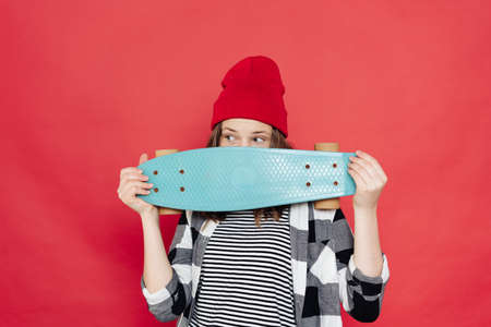 Happy stylish girl teenager wearing red beanie, white shorts and plaid shirt posing with penny board on red background