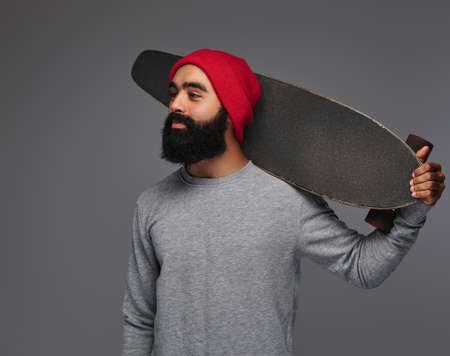 Portrait of a bearded male isolated on grey background.