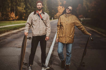 Attractive romantic couple is walking on the road surrounded with autumn trees while holding their longboards.