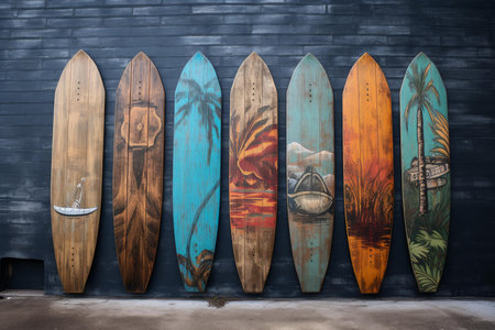 Lineup of painted surfboards featuring tropical scenes leans against a dark wooden wall