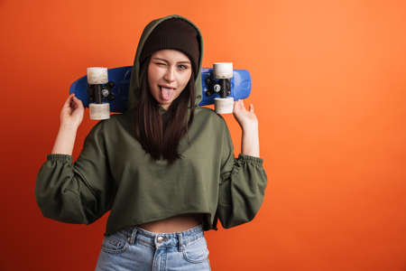 Happy young casual brunette woman with long hair wearing hat standing over red background, holding skateboard on her shoulders