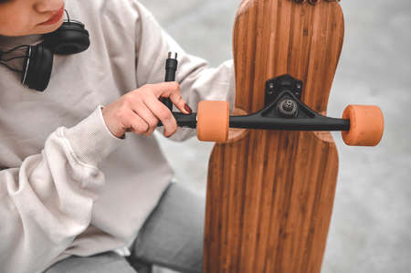 cute girl in hats with a skateboard in hands
