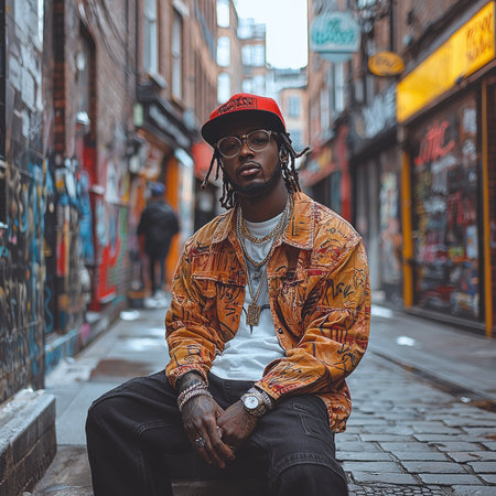 A trendy individual sits confidently in an urban alleyway surrounded by colorful wall art. The image emphasizes urban culture, contemporary fashion, and the vibrant atmosphere of the modern city streets.