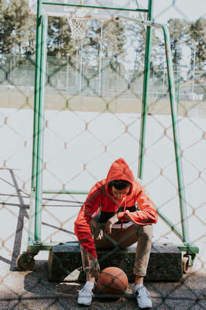 Horizontal studio portrait shot of handsome African American guy wearing orange hoodie and headphones sitting on floor looking away, copy space