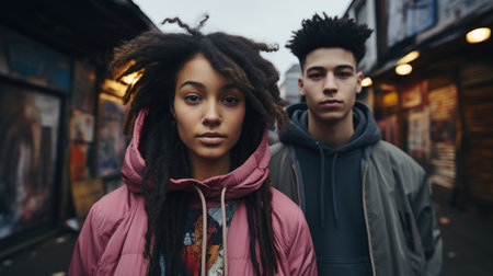 Portrait of an diversed group of young adults hanging out on urban street in summer. Generative AI image