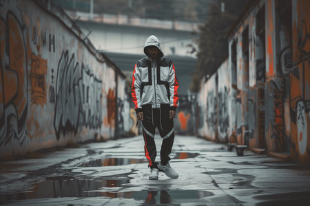 A man is walking down a rain-soaked alleyway with graffiti on the walls. The man is wearing a black and white jacket and black pants. Scene is somewhat bleak and urban, with the rain