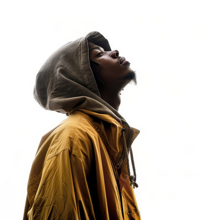A man in a hoodie gazes upwards towards the sky, his eyes fixated on an unseen object. His body language suggests contemplation and introspection as he stands alone in an outdoor setting.