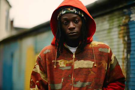 A man in a hoodie sits pensively in front of a vibrant graffiti wall in an urban setting surrounded by rich textures and colors.