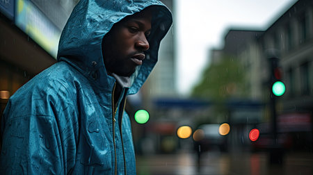 A close-up of black man runner with earphones and hood on his head in a city. Copy space.