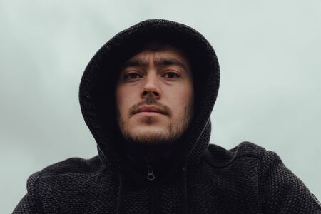 From below bearded male in black hoodie looking at camera against gray overcast sky on rainy day