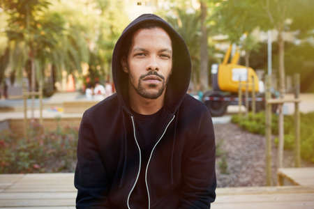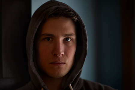 Dramatic portrait of serious hispanic teenager looking to the camera and wearing a hoodie.