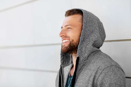 Young handsome bearded hipster man in gray sweatshirt with hood standing on the street.