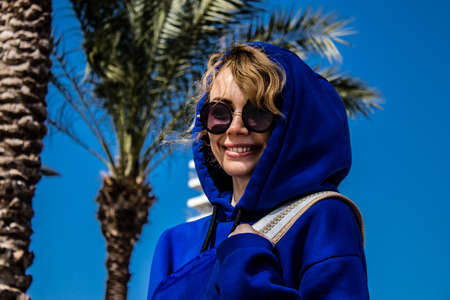 Long haired young happy attractive woman dressed in urban style hoodie standing against blue studio background and smiling, headshot of cheerful teenager being in good mood