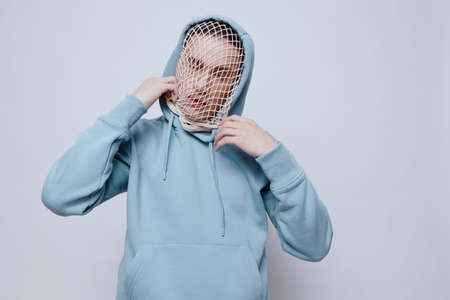 tortured, suffering from problems, a man with a mesh on his face stands in a light blue hoodie on a light background and pulls it aside