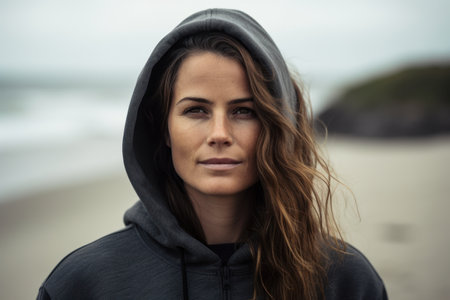 Portrait of a young beautiful woman on the beach, wearing hoodie