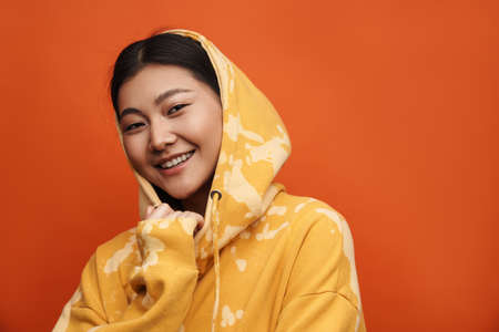 Asian teen girl wearing hoodie smiling and looking at camera isolated over orange background