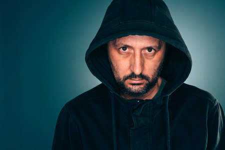 People and emotions. A brutal brunette man looks from under a black hood with a threat and distrust. Studio portrait on a black background.