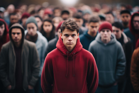 Lone Rebel - A portrait of a solitary figure highlighted amongst a sea of faces, capturing the essence of rebellion and nonconformity in youth culture.