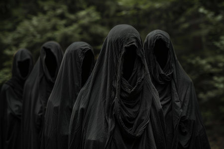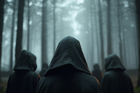 Mysterious hooded figures in foggy forest create an eerie halloween atmosphere and haunting mood