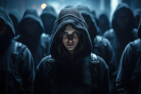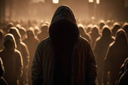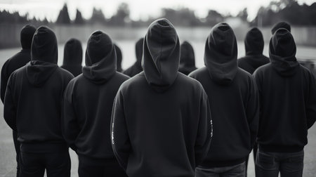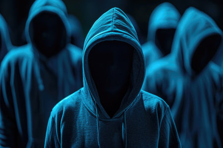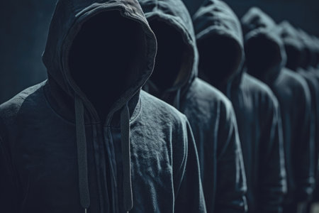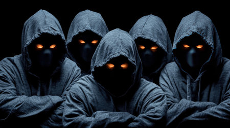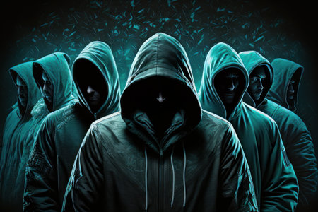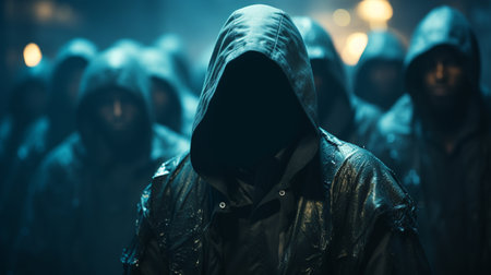 A group of people wearing hooded jackets stands together in a dimly lit area, Individuals wearing hoodies representing anonymous hackers, AI Generated