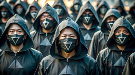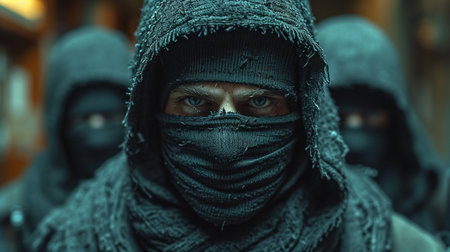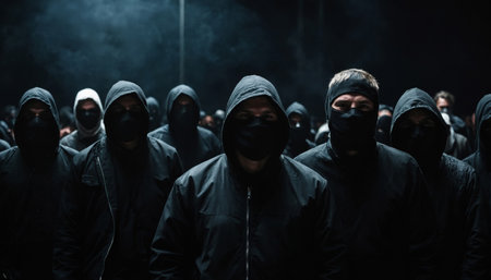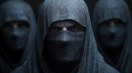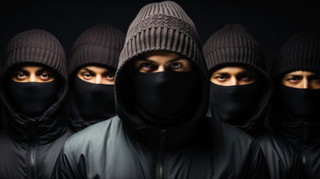Group of masked men in black masks looking at camera over dark background. Generative AI.
