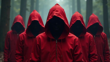 Five shadowy figures in striking red hooded jackets stand together, their faces concealed in darkness. The atmosphere is tense, hinting at a secretive gathering or unfolding drama.