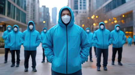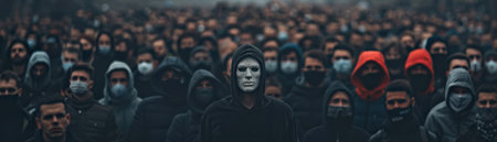 Crowd of the men in the street wearing black masks. Social problem, Epidemic, zombie apocalypse concepts.