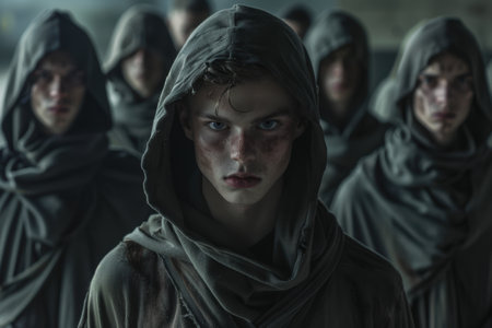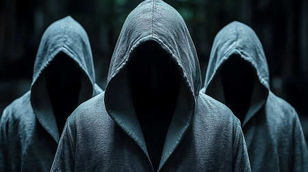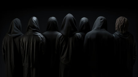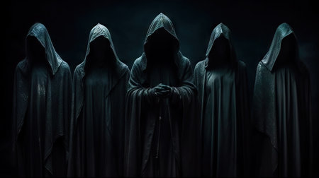 Cloaked figures huddle in low light, their faces hidden, exuding an aura of mystery.