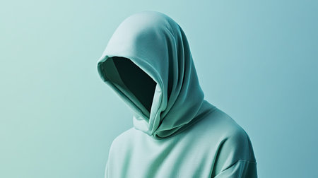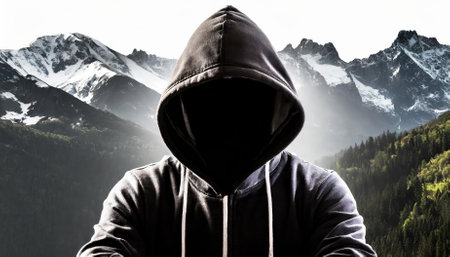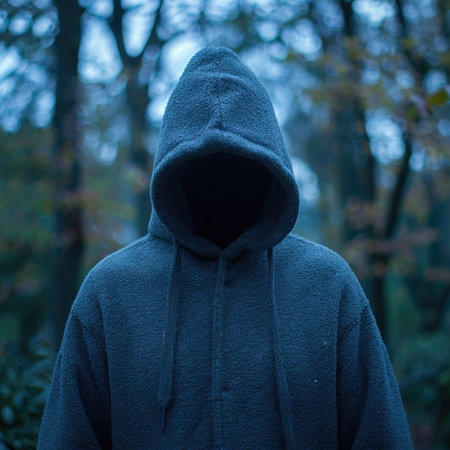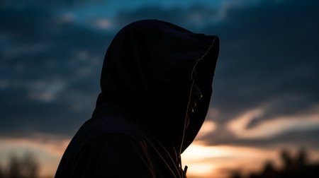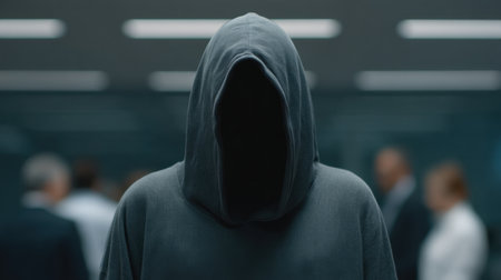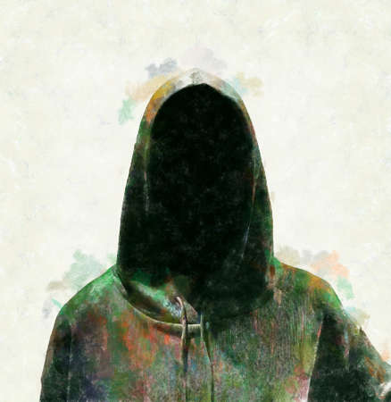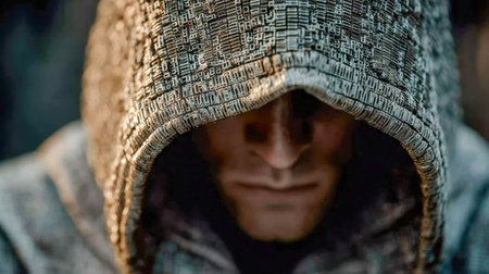 A hooded figure shrouded in mystery stands against a blurred background, evoking a sense of intrigue and anonymity in a dramatic and abstract composition.