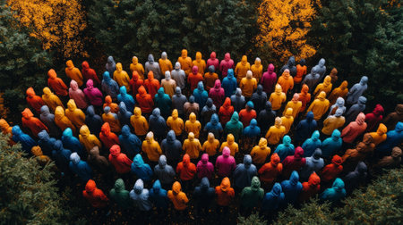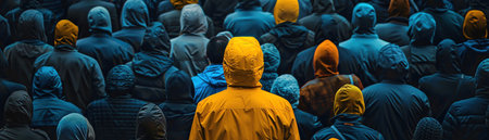 A man in a bright yellow jacket stands out in a large, anonymous crowd of people, symbolizing individuality