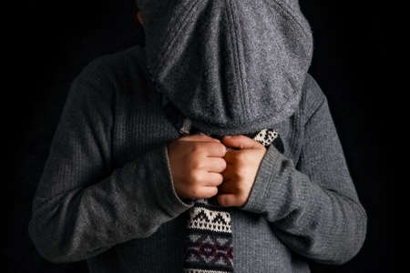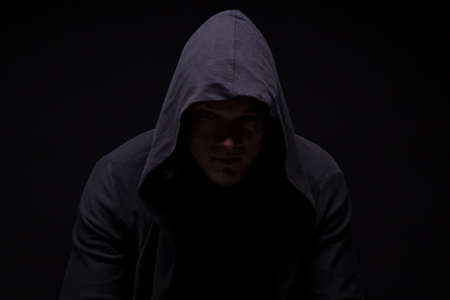 Stylish man in dark hoodie with black glasses and mask dark background, hacker, attacker and bandit