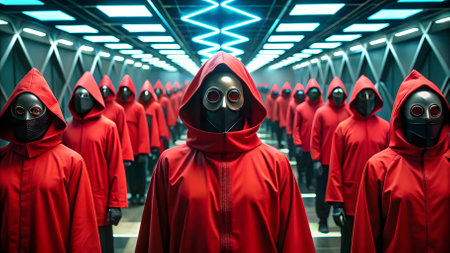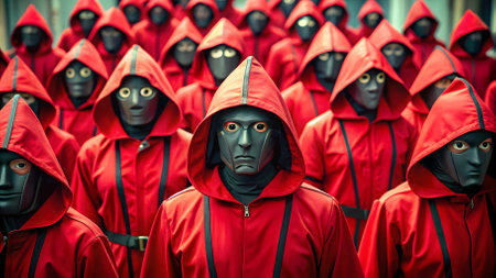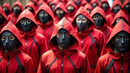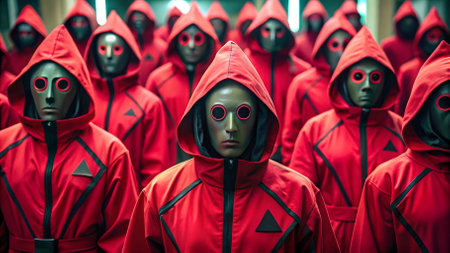 Group of people in red hooded suit with black mask. Guard mask from the movie squid game. Famous Korean Squid Game.