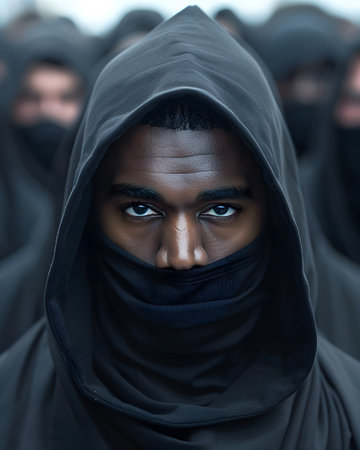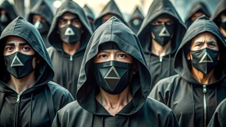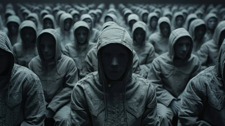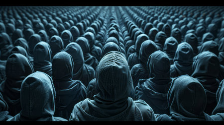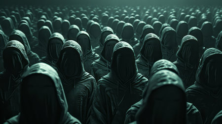 A haunting image of hooded figures in a crowded stadium, creating an eerie atmosphere.